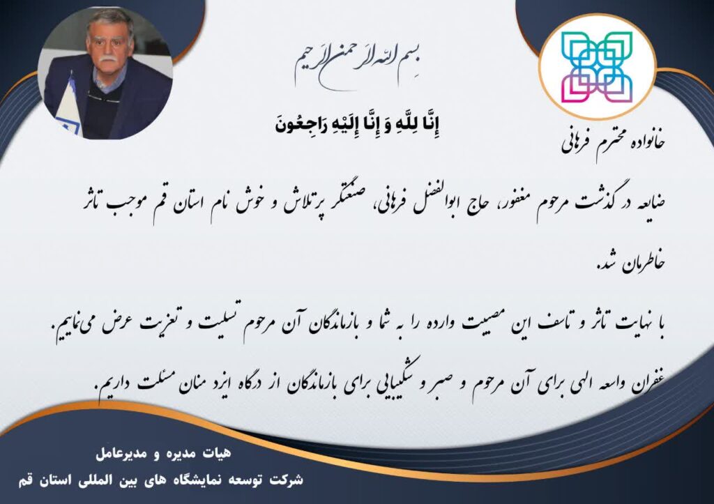 ۰۴ مرداد اطلاعیهها ارسال شده توسط روابط عمومی ۰ نظر پیام تسلیت مدیرعامل و هیات مدیره شرکت توسعه نمایشگاه های بین المللی استان قم پیرامون درگذشت صنعتگر پرتلاش حاج ابوالفضل فرهانی مدیر عامل و هیات مدیره شرکت توسعه نمایشگاه های بین المللی استان قم با صدور پیامی، درگذشت صنعتگر پرتل... ادامه مطلب