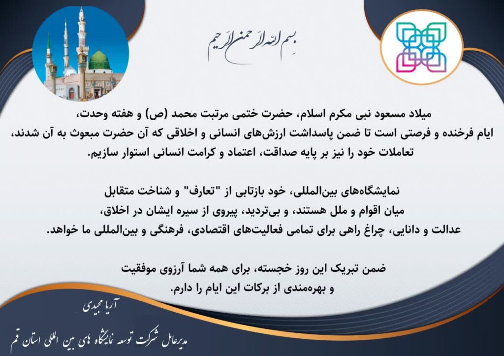 ۱۹ شهریور اطلاعیهها ارسال شده توسط روابط عمومی ۰ نظر پیام مدیرعامل شرکت توسعه نمایشگاه های بین المللی استان قم به مناسبت میلاد با سعادت حضرت نبی اکرم(ص) و هفته وحدت به گزارش روابط عمومی شرکت توسعه نمایشگاه های بین المللی استان قم، آریا مجیدی، مدیرعامل شرکت توسعه نم... ادامه مطلب